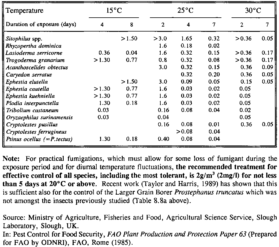 Detailed information on the properties and use of phosphine and methyl bromide as grain fumigants, including application procedures for fumigations in various types of fumigation chamber or under gas-proof sheets, is included in a separate FAO publication (Bond, 1984) and is not reproduced here. General guidance on dosage rates, however, is given in Tables 8.8a and 8.8b. It should be noted that, for phosphine, there are considerable differences in tolerance amongst the various insect pests of stored grain. The data in Table 8.8a (see Table 8.8a. Average concentrations of phosphine (mg/l) required to give 100 per cent mortality of all developmental stages of insects under experimental conditions.) are intended to illustrate this rather than to indicate practical dosages. A general dosage recommendation is given beneath the table. For methyl bromide, differences in the amount of gas sorbed by particular commodities are generally more important and these are taken into account by the schedules presented in Table 8.8b (see Table 8.8b. Dosage schedules for fumigation with methyl bromide where the enclosed volume is filled, e.g. stacks under gas-tight sheets.).