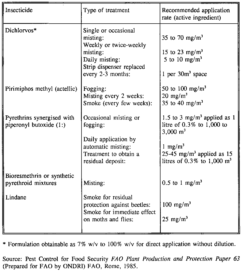 Currently acceptable compounds, and recommended rates for their application as dust formulations admixed with cereals or as liquid surface treatments, are given in Table 8.9. Compounds used for space treatments, and their recommended application rates, are given in Table 8.10. These two tables (and Tables 8.5 - 8.8) are reproduced from FAO Plant Production and Protection Paper 63 (Anon., 1985), a manual of pest control for food security reserve grain stocks prepared for FAO by the former Storage Department of TDRI (now NRI). This contains detailed information on application procedures and equipment for fumigants and contact insecticides.