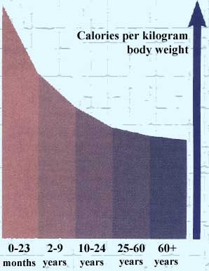 | Energy requirements are determined by body size, activity level and physiological conditions such as illness, infection, pregnancy and lactation. As body size increases, so does the total energy requirement; however, per body unit, the energy requirement decreases. | |