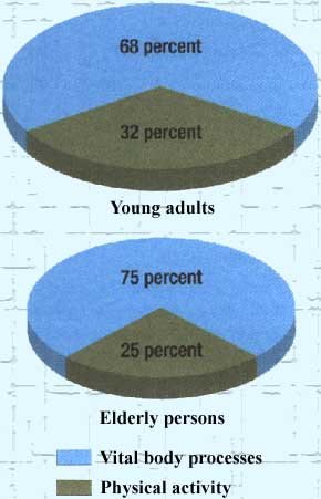 | The pattern of energy expenditure tends to change with age. Elderly people tend to use less energy, primarily as a result of reduced physical activity. | |