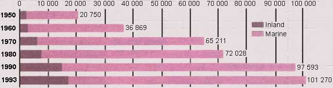 The world's fishing fleet has grown twice as fast as catches and there are now about 3.5 million vessels worldwide. Asia has the largest fleet with 42 percent of the total registered tonnage, followed by the republics of the former USSR with 30 percent. Africa has the smallest one at 2.7 percent. Government subsidies have helped keep most big fishing fleets afloat: in 1989 the world's 20 largest fishing nations paid out US$ 54 000 million in subsidies to catch US$ 70 000 million worth of fish. Such overcapacity has led to chronic overfishing with too many boats chasing too few fish.
