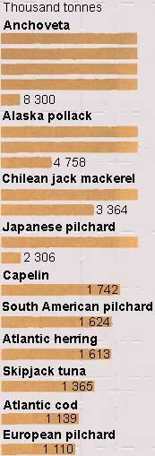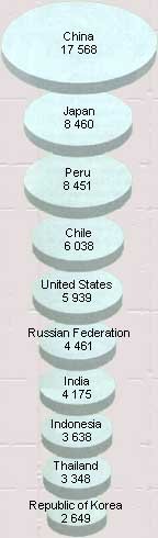 Area numbers 01-07 refer to inland fisheries. All other area numbers refer to marine fisheries. Countries which caught over 200 000 tonnes within each marine FAO area are listed and those which caught over 1 million tonnes are shown in capitals.