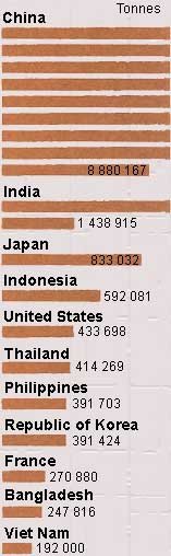 Asia accounted for nearly 87 percent of the world's fish farming output in 1993: 63 percent of its share was produced by China, with India as the next biggest contributor.