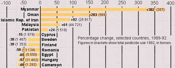 Pesticides help. Their use multiplied by a factor of 32 between 1950 and 1986, with developing countries now accounting for a quarter of the world's pesticide use. But inappropriate and excessive use can cause contamination of both food and environment and, in some cases, damage the health of farmers. Pesticides also kill the natural enemies of pests, allowing them to multiply; meanwhile the number of pest species with resistance to pesticides has increased from a handful 50 years ago to over 700 now.
