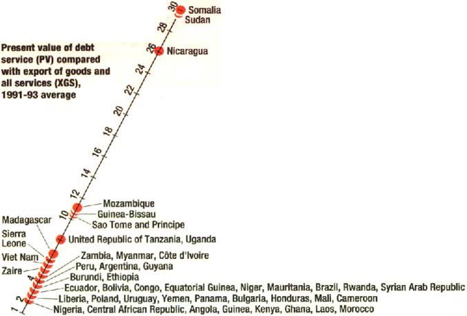 | Many developing countries are so indebted that their total annual repayments outstrip foreign exchange earnings up to 30 times over. |
