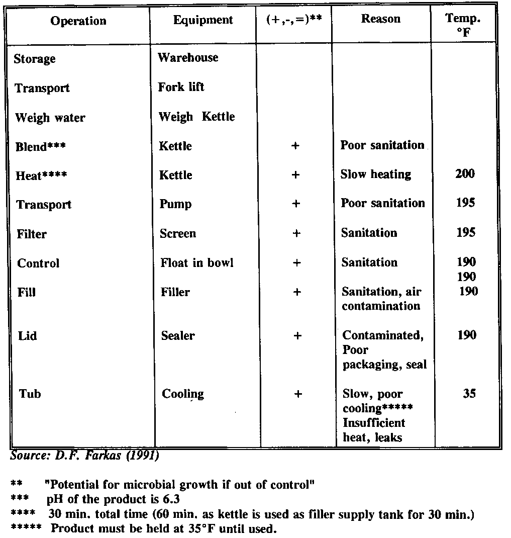 Food processing steps require a detailed description when microbial safety is a concern. The reason for this is that ingredients, packages, equipment, and the surroundings all potentially can contaminate the final product with pathogenic or spoilage microorganisms. Table 10.3.1 is a simple process description from a Hazard Analysis point of view.