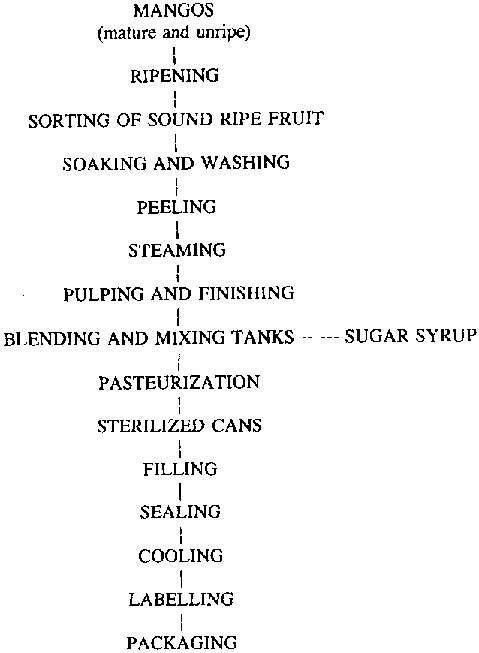 The peeled mangos are steamed and pulped. The coarse pulp thus obtained is sieved with the help of a finisher and conveyed to the blending, mixing and heating tanks where the requisite quantity of sugar syrup is added. The juice is then pasteurized, filled into the steamsterilised cans and sealed. The sealed cans are water-cooled, labelled and packaged for sale.
