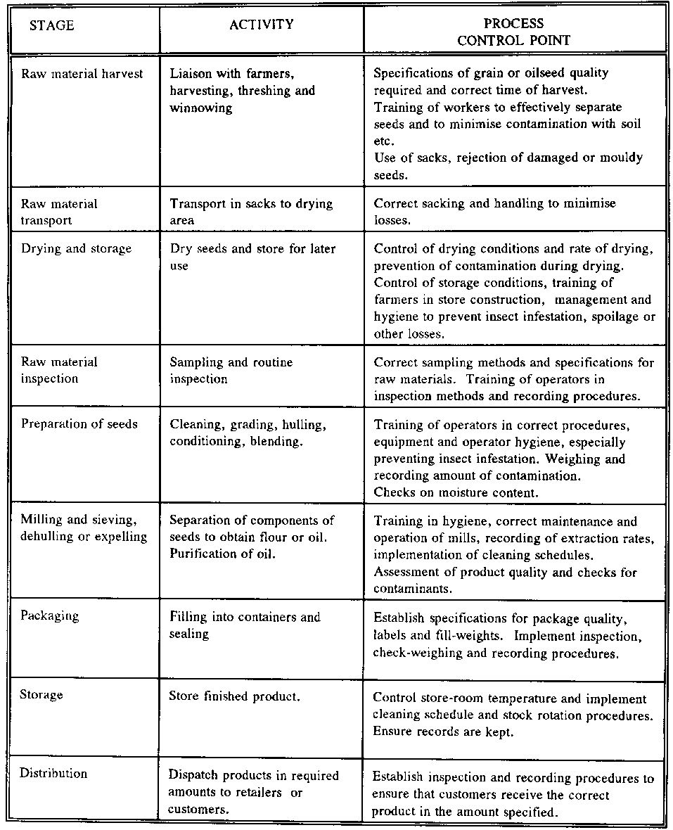 The main quality factors for milled products are the need for correct raw material storage to maintain the characteristic milling qualities and flavour, the absence of moulds or other contaminants and the correct moisture content for processing. During processing, the main quality control measures are concerned with correct operation of mills, dehullers or oil expellers to maximise yields and give the desired quality characteristics in the finished products. These aspects are described in more detail below, together with information on packaging and storage control for individual products.