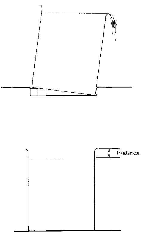 A headspace gauge (Figure 39 : A headspace gauge used to check the depth of a headspace) is a cheap and simple way of routinely checking that product has been filled to the correct level. It consists of a series of prongs of different lengths fixed onto a bar and it is placed on the rim of the jar before fitting the lid. The level of product may then be seen where it touches one of the prongs. Alternatively a device (Figure 40: A simple way of ensuring a consistent headspace) can be fitted into the production line to maintain a uniform headspace.
