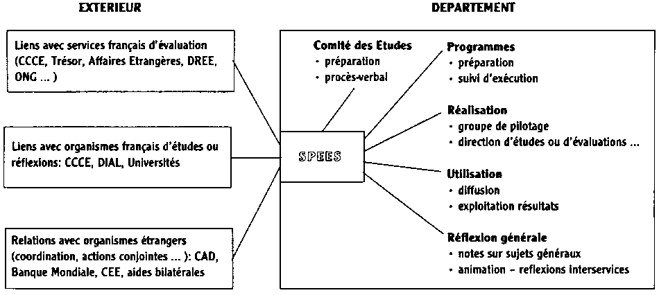 Le Ministère de la Coopération a regroupé en 1982 les études économiques générales et les évaluations de projets et de programmes dans une nouvelle organisation originale qui permet leur bonne insertion dans les activités opérationnelles du Ministère: le Secrétariat Permanent des études, évaluations et statistiques (SPEES).