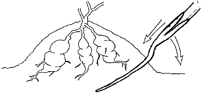 (i) Root and tubers - like sweet potatoes, yams, cassava and ginger, may be completely buried in the soil, or may be partly visible above the soil surface, as in dasheen, carrots and turnip. Those which develop below soil level, if they are small, are best grown in mounds or raised beds, so that a digging tool can be easily pushed underneath to lift them when they can be freed from the soil without damage. (see Figure 3.2. Harvesting root crops with a fork).