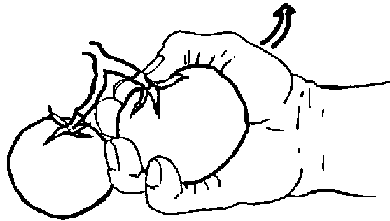 Some fruit, such as passion fruit and tomatoes have a natural 'break-point' at which they can easily be removed from the parent plant, leaving the fruit stalk attached to the fruit. These are usually harvested by hand using the 'lift, twist or pull method', (see Figure 3.4. Harvesting tomato by the lift and twist method). Passion fruit, however, may be left on the vine until fully ripe and harvested by shaking the trellis on which they grow, causing ripe fruit to fall to the ground, from where they are gathered. They suffer little or no damage due to the hardness of the outer "shell".