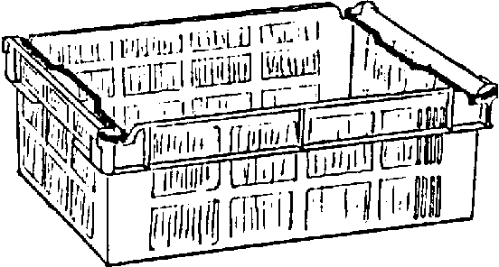 A collapsible crate consists of a base with sides attached to it by plastic or metal hinges. Despite the saving of space when folded and their attractive design, this crate is generally not accepted in trade, most likely because of the high purchase cost.