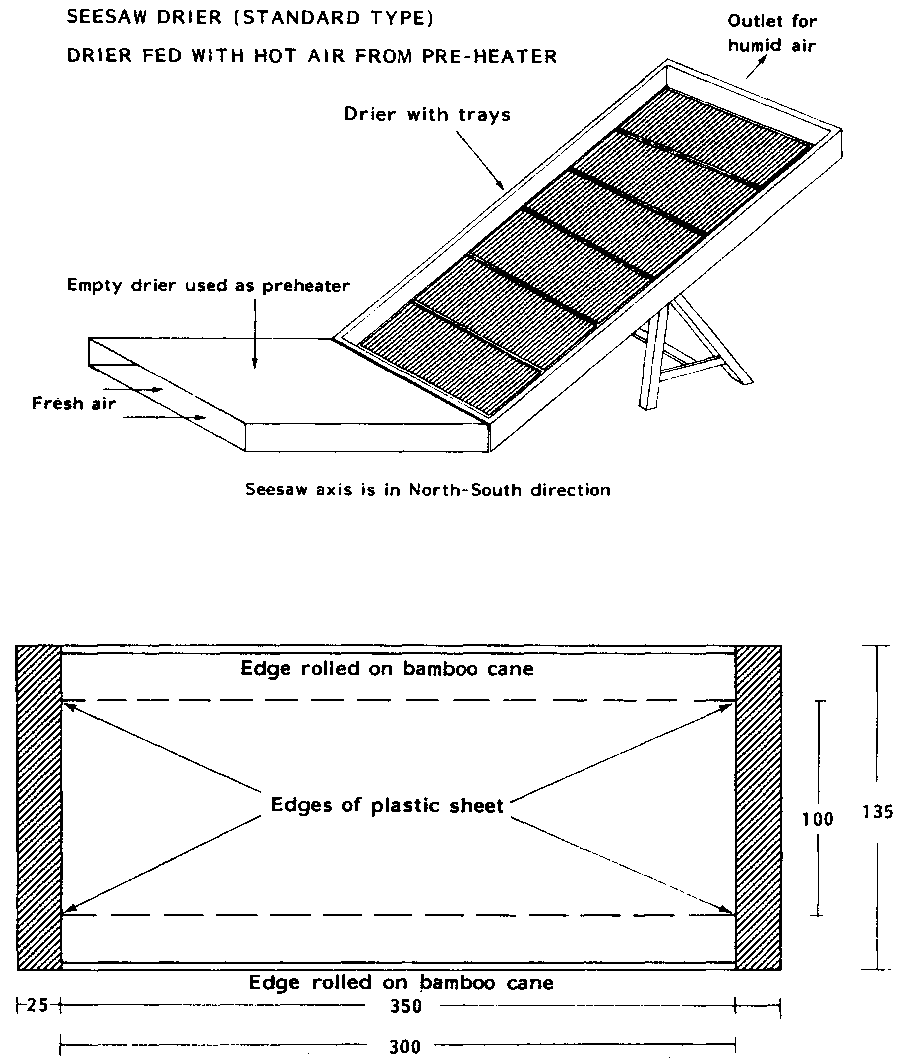 Air circulation is secured by convection (the tendency of hot air to rise), the drier being tilted at an angle of 30 : fresh air enters at the lower end of the chamber formed by the trays and the plastic covering' escaping at the upper end. A 3 m long drier tilted 30 has 1.40 m difference in levels of air inlet and air outlet.