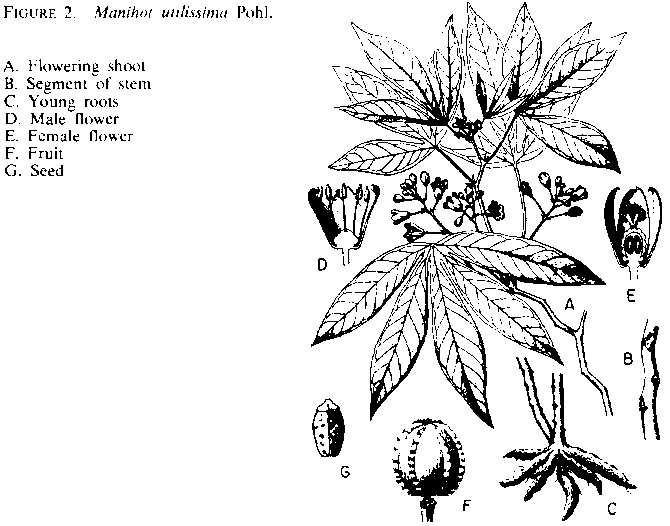 The cassava plant is a perennial that grows under cultivation to a height of about 2 4 m. The large, palmate leaves ordinarily have five to seven lobes borne on a long slender petiole. They grow only toward the end of the branches. As the plant grows, the main stem forks, usually into three branches which then divide similarly. The roots or tubers radiate from the stem just below the surface of the ground. Feeder roots growing vertically from the stem and from the storage roots penetrate the soil to a depth of 50-100 cm. This capacity of the cassava plant to obtain nourishment from some distance below the surface may help to explain its growth on inferior soils.