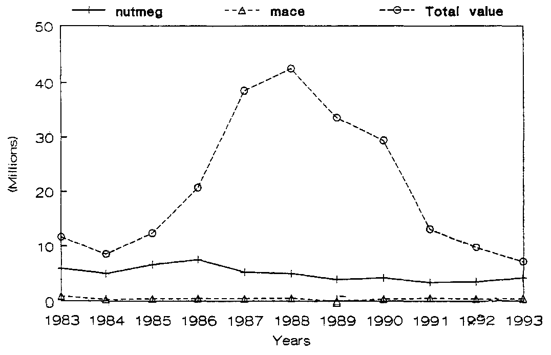 Table 9 and fig. 8 dramatically demonstrates the fluctuations in export prices for the period 1983 - 1993 with a dramatic peak in 1988 where for the export of just about five (5) million pounds of nutmeg and just about half (1/2) million pounds of mace the return was about forty two (42) million dollars EC, approximately 15.5 million dollars U.S.