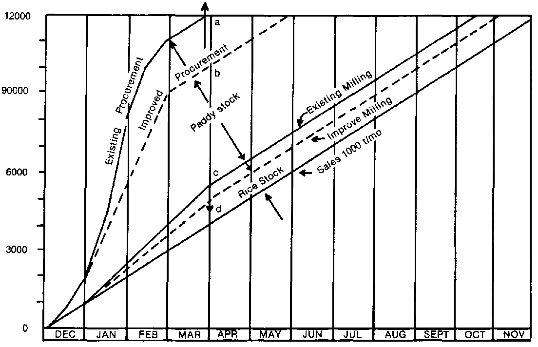 Sales of milled rice at 1000 metric tons per month would require 12,000 tons of paddy (in rice equivalent) to be procured by end of harvesting season.