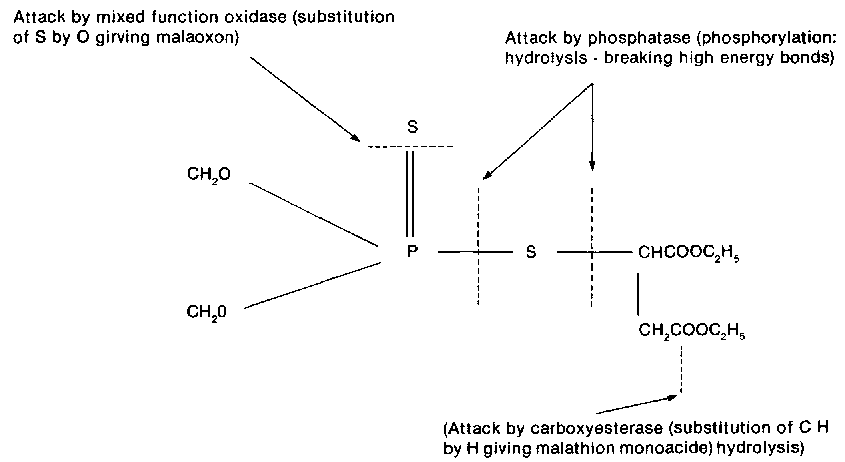 Malathion acts as a contact poison which is absorbed through the cuticle. Once inside the body it is oxidized to malaoxon I(CH3O)2P(0)SCH (CO.OC2H5)CH2CO.OC2H5l, which then acts as a powerful cholinesterase inhibitor. This process of conversion of malathion is known as activation, resulting in a disruption of nerve activity due to acetylcholine accumulation at the nerve endings which results in excitability, muscular tremors and finally paralysis (O'Brien, 1967).