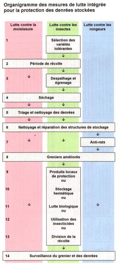 Cependant, il y a une demande pressante pour des "technologies de lutte intégrée post-récolte" toutes faites pouvant être transmises aux paysans par le canal d'une approche "descendante". De telles approches connaîtront invariablement d'échec, parce qu'elles ne prennent pas en compte les conditions socio-culturelles et économiques qui varient suivant les cas. Le présent dépliant ne peut prétendre de remplir toutes ces conditions. Ii donne plutôt un aperçu global des méthodes communément utilisées et des mesures de lutte contre le GCM et autres ravageurs des stocks, y compris la prévention du développement de la moisissure. Les méthodes de lutte qui ne comportent pas l'utilisation des insecticides synthétiques sont celles particulièrement recommandées dans cette brochure.