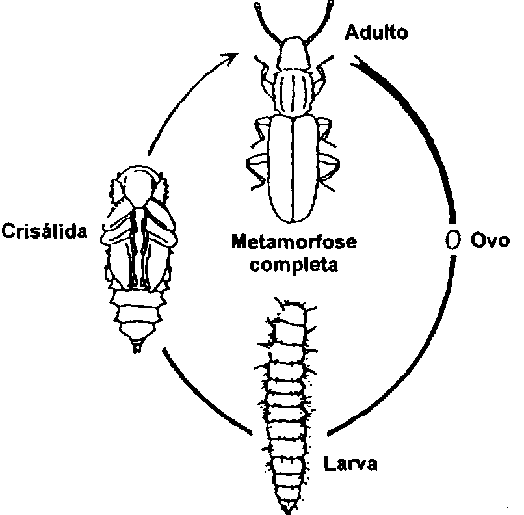 Ao igual que os outros insectos, também os coleópteros e as traças passam por diferentes estádios de desenvolvimento. Os insectos adultos põem os ovos, dos quais saim as larvas. As larvas causam a maioria dos danos como resultado da sua alimentação com o produto armazenado. O seu desenvolvimento passa por uma série de estádios, acabando todos na transformação em crisálida. O adulto forma-se a partir da crisálida. Este cicio de desenvolvimento é chamado metamorfose completa. A duração deste cicio varia dependendo da espécie e é muito influenciada por factores externos (veja-se secção 7.4).