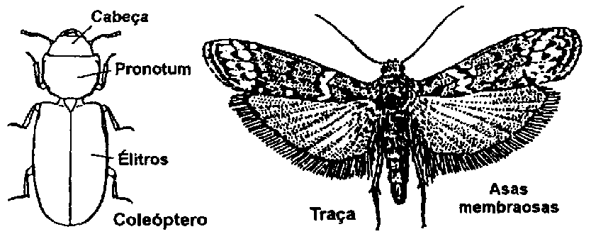 Exemplos: curculonídeos, Rhyzopertha dominica, Sitotroga cerealella