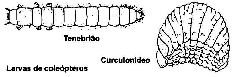 As larvas dos coleópteros têm três pares de patas. Não obstante, em algumas espécies que se desenvolvem no interior do grão (p.ex. nos curculonídeos), elas faltam.