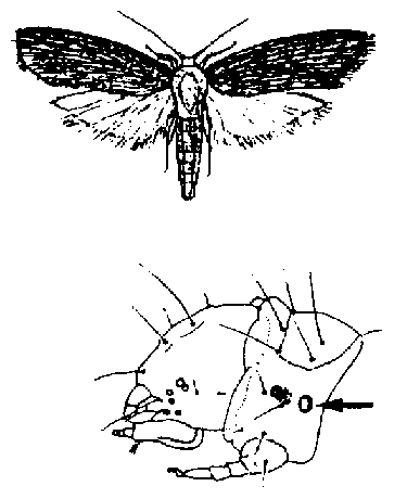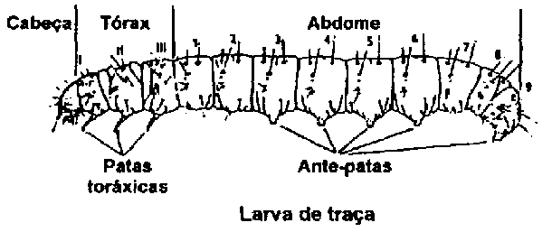 As larvas das traças têm três pares de patas torácicas e adicionalmente quatro pares de patas falsas localizadas no 3°, 4°, 5° e 6° segmento do abdome. O último segmento do abdome tem outro par de patas falsas.