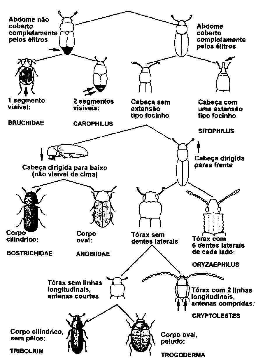 A chave seguinte só se refere aos coleópteros encontrados mais frequentemente no produto armazenado e não é um útil de classificação abarcador de todas as espécies. Toda identificação deveria ser confirmada por meio de comparações com outras ilustrações, descrições ou espécies de colecções de referência.