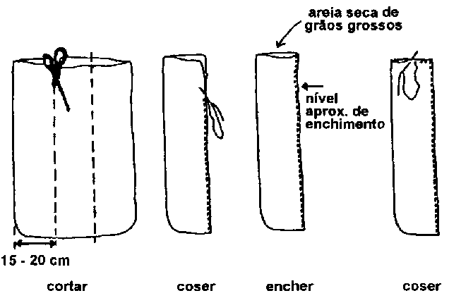 - lonas de fumigação velhas cortadas em pedaços de tamanho adequado e cosidos de maneira a obter uma forma de salsicha