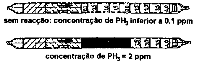 Estes tubos foram concebidos especialmente para determinados tipos de gases. Para efectuar a medição, deve-se abrir um tubo nas duas extremidades e inserir o mesmo na bomba no sentido indicado pela flecha. Segurar depois o detector no ar que deve ser medido e aspirar no tubo pressionando e soltando a borracha de sucção. A quantidade de pressões necessárias para a medição, éindicada nas instruções. A concentração de gás pode ser reconhecida directamente pela alteração da cor no tubo calibrado:
