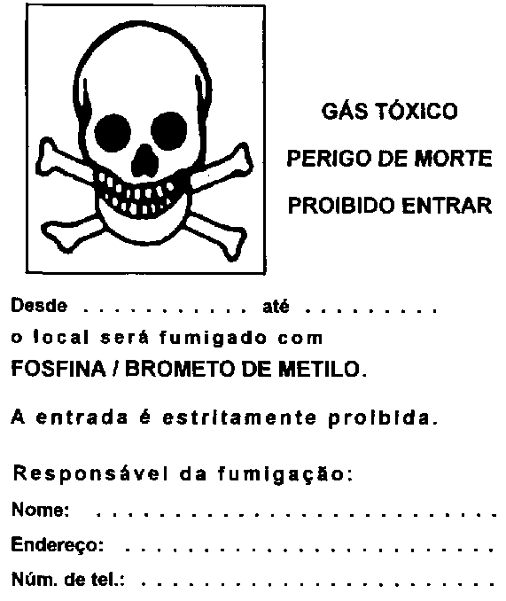 - Fechar à chave o armazém uma vez terminada a aplicação do fumigatório e colocar urna placa de advertência (veja-se pagina seguinte) em cada porta, indicando o tipo de fumigatório utilizado, a data de tratamento, o nome da pessoa encarregada da fumigação e o lugar aonde esta pode ser alcançada.