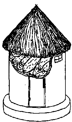 Ce type de grenier est fréquemment érigé sous un arbre à feuilles persistantes dispensateur d'ambre. Le grenier est constitué d'un abri de forme conique à la pointe dirigée vers le haut, bien qu'il puisse être également de forme oblongue, comme celui qui est représenté à la fig. 2. Les tubercules sont stockés les uns sur les autres sous le toit protecteur (N'KPENU et TOUGNON, 1991).