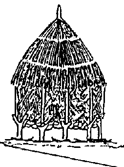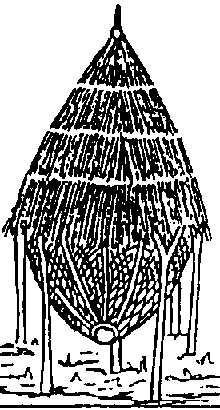 Le "Tonneau", qui est construit sur une plate-forme basse, est effectivement comparable à un gros tonneau. Il comprend un cadre de bois, tendu de nattes tressées. Le "Tonneau" est ouvert dans sa partie supérieure et fermé par un toit de forme conique (figure 18). Ce type de grenier mesure souvent plus de 2 mètres de haut. Il s'agit là encore d'un système ouvert, permettant un échange d'air entre la marchandise et I'environnement.
