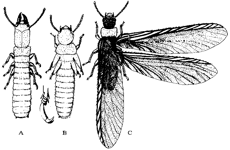 - Ecailles alaires antérieures petites n'atteignant pas les écailles postérieures (fig. 32 B) ............................................................................Termitidae