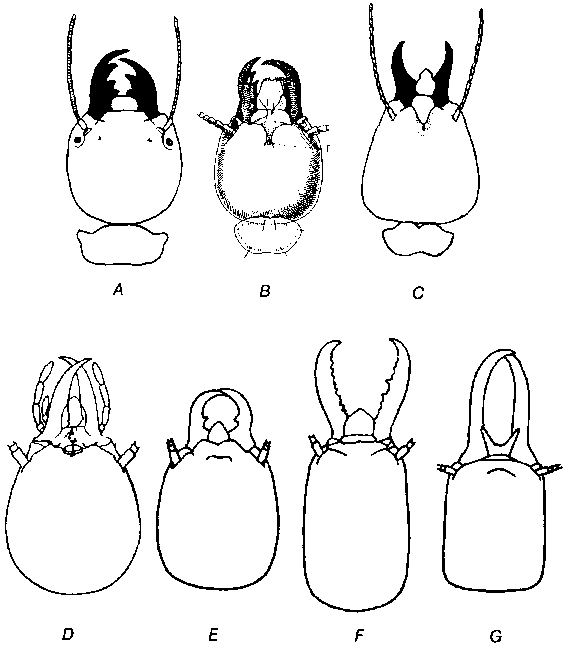 b) Tête ramassée, en forme de goutte, bombée en avant, avec bord antérieur tronqué droit ou incurvé (fig. 28). Les espèces du genre Cryptotermes BANKS, 1906, vivent principalement dans le bois très sec, y compris celui des meubles, et plusieurs ont été importées par l'homme dans presque tous les pays tropicaux, ainsi, en particulier, C. brevis (WALKER, 1853), C. domesticus (HAVI LAND, 1898), C. dudleyi BANKS, 1918 et C. havilandi (SJOESTEDT, 1909).