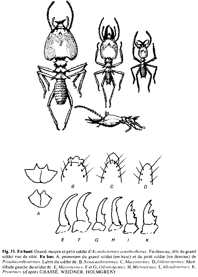 13. Bord antérieur du pronotum 2 épines dirigées en avant; chaque côté des méso- et métanotum avec une épine dirigée en arrière (fig. 31 en haut)..................................... Macrotermitinae: Acanthotermes SJOESTEDT, 1900