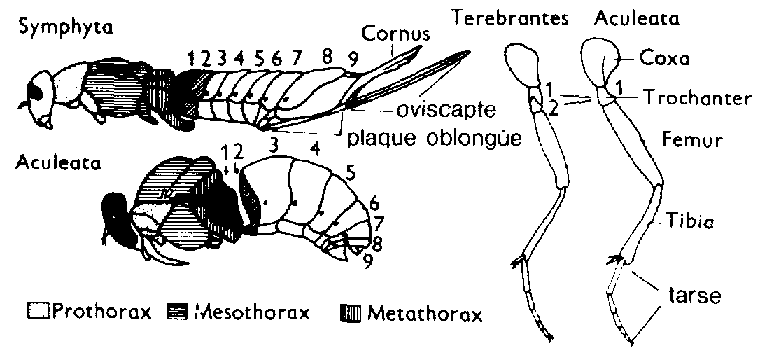 Fig. 33. Caractères distinctifs des sous-ordres des hyménoptères. 1-9 = tergites abdominaux.
