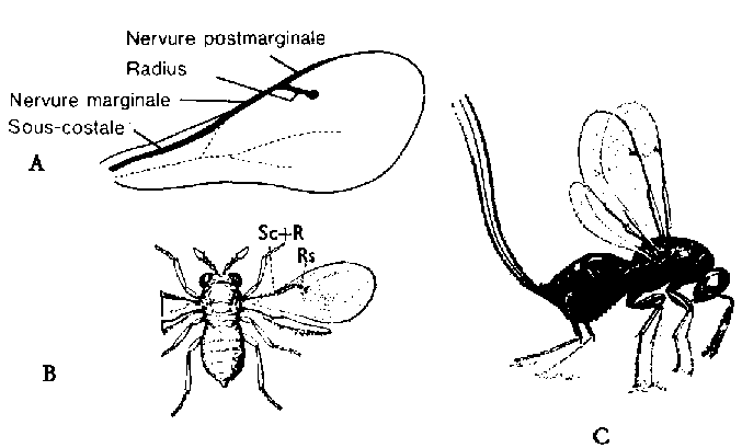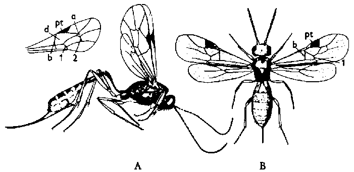 - Tarses de 5 articles. Tarses antérieurs avec un grand éperon terminal recourbé; tarses postérieurs avec un seul éperon terminal. Nervure marginale plus courte que la distance qui la sépare de la base de l'aile (fig. 36 A). Petits chalcidiens (jusqu'à 3 mm de long) vert à bleu métallique, chatoyants ....................... Pteromalidae