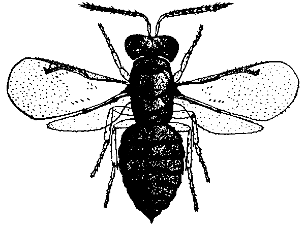 - Antenne coudée (fig. 36, 37); nervation alaire très réduite (fig. 36, 37). Souvent couleurs métalliques. Ailes parfois atrophiées ................. Chalcidiens (Chalcidoidea)