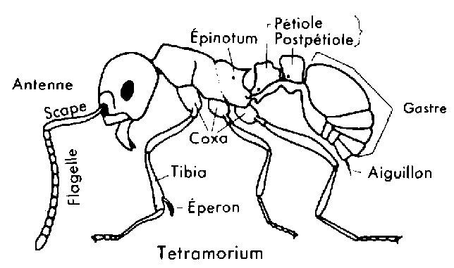 10. Pétiole de l'abdomen formé d'un seul article avec une écaille dressée (fig. 39) ou de deux renflements ou noeuds (pétiole et postpétiole) (fig. 38). Antennes coudées. Insectes sociaux. A côté des mâles et femelles sexués, temporairement ailés, les colonies comprennent un grand nombre d'ouvrières aptères (femelles stériles)......................... Fourmis (Formicoidea)