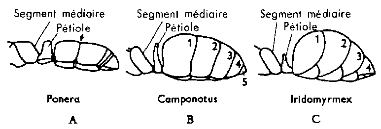 Les segments du gastre sont numérotés de 1-5. Cet organe ne correspond pas à l'abdomen entier, car le segment médiaire soudé au thorax et le pétiole représentent les premier et second segments abdominaux.