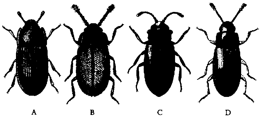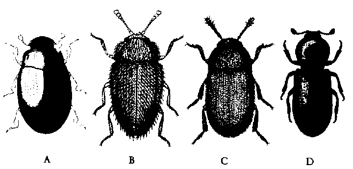 - Pronotum sans carène sur les côtés. Corps allongé, ovale, faiblement bombé. Elytres avec fines stries ponctuées et des rangées longitudinales de soies obliques courtes alternant avec des rangées de soies longues couchées. Brun rougeâtre (fig.46 C). Lg. 2,5-3 mm........ Mycétophage des céréales, Typhaea stercorea (LINNÉ, 1758) (Mycetophagidae)
