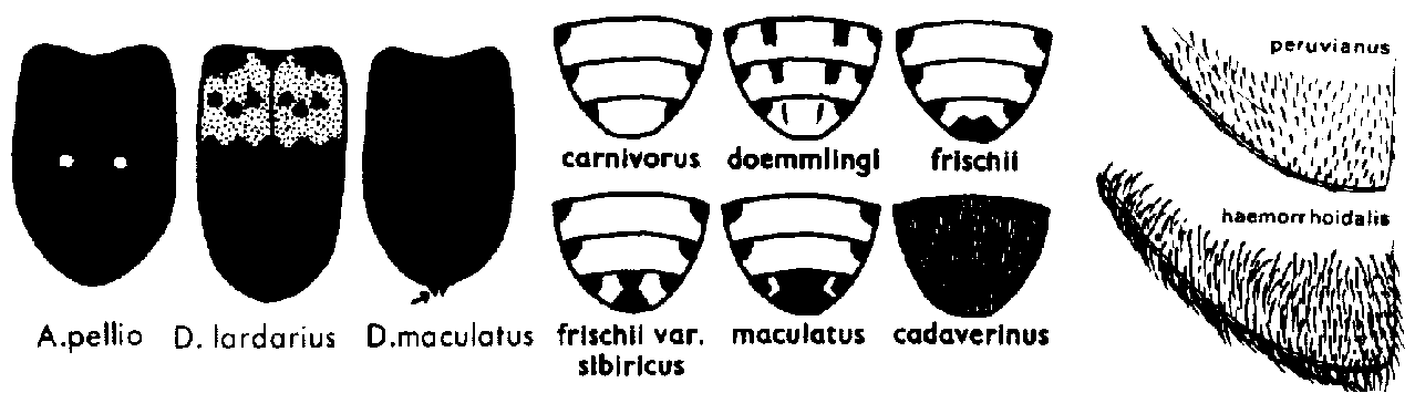 6. Extrémité du dernier sternite abdominal noire. Chez la forme nominale, cette tache n'atteint pas le bord postérieur du précédent sternite, ce qui est le cas chez la var. sibiricus ERICHSON, 1846 (fig.50). Une tache noire aux angles antérieurs de chaque sternite abdominal. Lg. 6-10 mm......................................................... Dermesto destructeur du cuir, D. frischii ICUGELANN, 1792