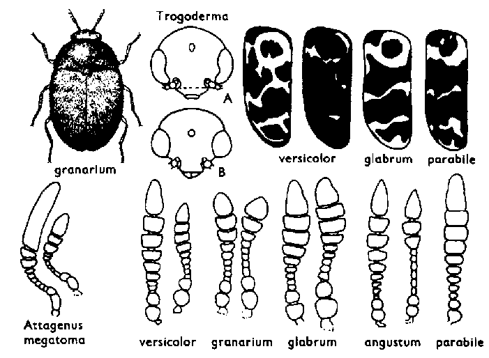 - Massue antennaire du mâle de 8 articles, le dernier arrondi à son extrémité. Soies claires du pronotum presque exclusivement brun-doré (fig. 51 parabile). Lg. (sans la tête) 2,7-4,4 mm.................................................................. Trogoderma variable BALLION, 1878 (=parabile BEAL, 1954)
