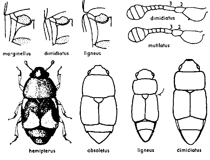- Antennes avec massue de 3 articles. Elytres unicolores et sans dessins