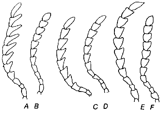 15. Antennes pectinées chez le mâle, avec articles 4-10 fortement étirés, simplement épaissies vers l'extrémité chez la femelle, de coloration jaune-brun ou avec articles 4-11 brun foncé (fig. 68 A, B). Elytres à peine plus longs que larges ensemble, avec trois fascies transversales brunes, la première à la base, la seconde un peu après le milieu, la troisième en occupant la partie apicale, séparées par deux bandes pubescentes d'un blanc rosé. Très reconnaissable aux deux callosités d'un blanc nacré sur le lobe basal du pronotum (Pl. C, e). Lg.2,2-2,5 mm ...... Bruche chinoise, Callosobruchus chinensis (LINNÉ, 1758)