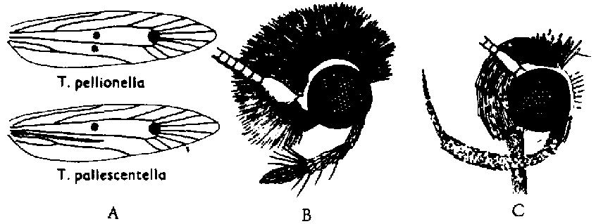 - Sur les ailes antérieures, de couleur jaune terreux, la bande longitudinale est réduite à un point qui se trouve à côté du point noir médian (fig. 87 A, en haut). Ces deux points peu vent manquer, mais le point situé sur la nervure transversale est toujours présent. Envergure 11-17 mm (fig. 85) .......................... groupe de la Mite des fourrures, Tinea pellionella LINNÉ. 1758)