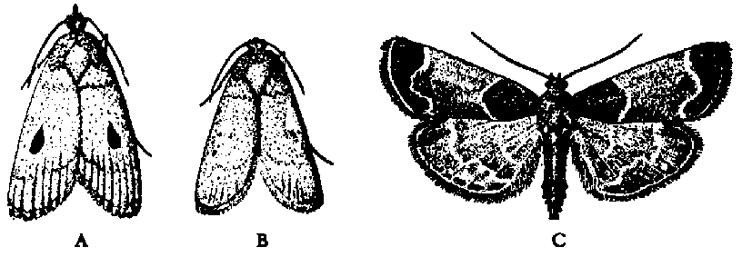 Fig. 91. Aphomia gularis: A, mâle; B. femelle; C, Pyralis farinalis (A, B. de LIEBERS; C, de WEBER).