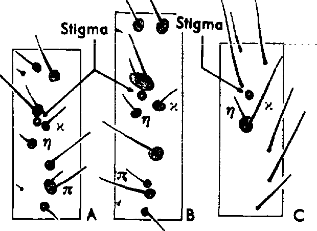 - Soies dorsales (a et ß) avec taches foncées à leur base (fig. 95, Ephestia). La plaque triangulaire de la face antérieure de la tête (à l'exception d'E. kuehniella) correspond à la moitié de la distance qui sépare son bord antérieur du vertex (fig. 100 B et Pl. C, fig. i). Les crochets des pattes abdominales sont de deux sortes quant à leur longueur, les petits correspondant au tiers des grands. Chenilles blanchâtres, souvent avec un ton coloré qui dépend du contenu intestinal. ............ Ephestia 15