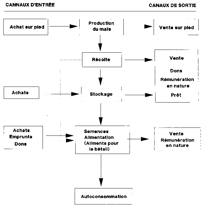 Au niveau de la destination du mais, c'est le comportement du paysan en matière de décision qui domine l'analyse. Le mais peut être utilisé soit au sein de l'exploitation agricole, soit à l'extérieur. Au sein de l'exploitation, il va servir à l'auto-approvisionnement de la famille, à l'extérieur de l'exploitation comme moyen d'échange. Le mais remplit plusieurs fonctions en tant que moyen d'échange. Par la vente (échange contre de l'argent), il est transformé en liquidités et devient pour lexploitation une importante source de revenus. A l'échelon du village, il sert à rémunérer certains travaux agricoles (échange de mais contre du travail), constitue un moyen d'échange pour se procurer des produits, alimentaires ou autres (troc en nature), mais il sert également de cadeau ou de sacrifice (échange dans le cadre d'obligations sociales ou de coutumes).